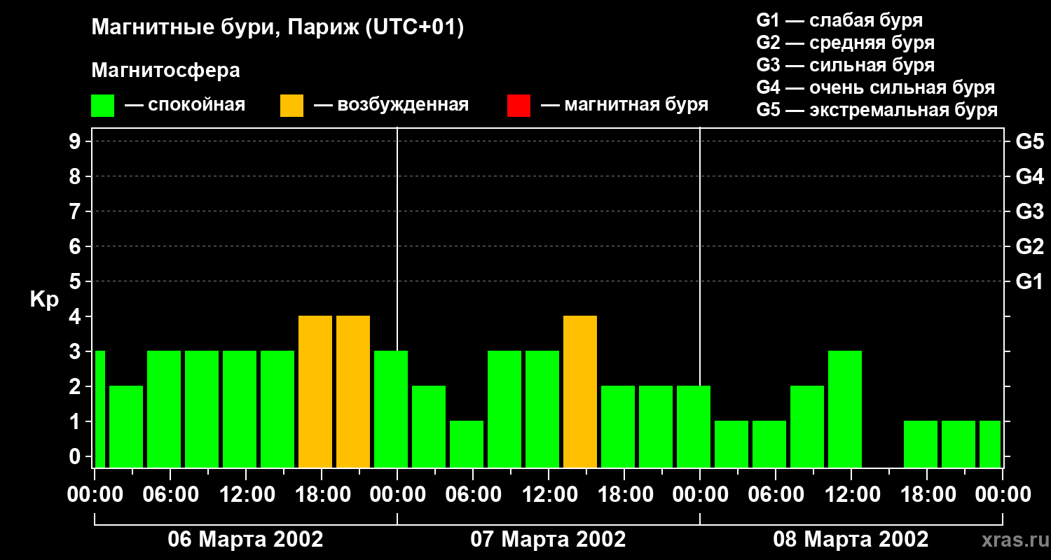 Изменения геомагнитного индекса Kp с 6 по 8 марта 2002 года для средних широт