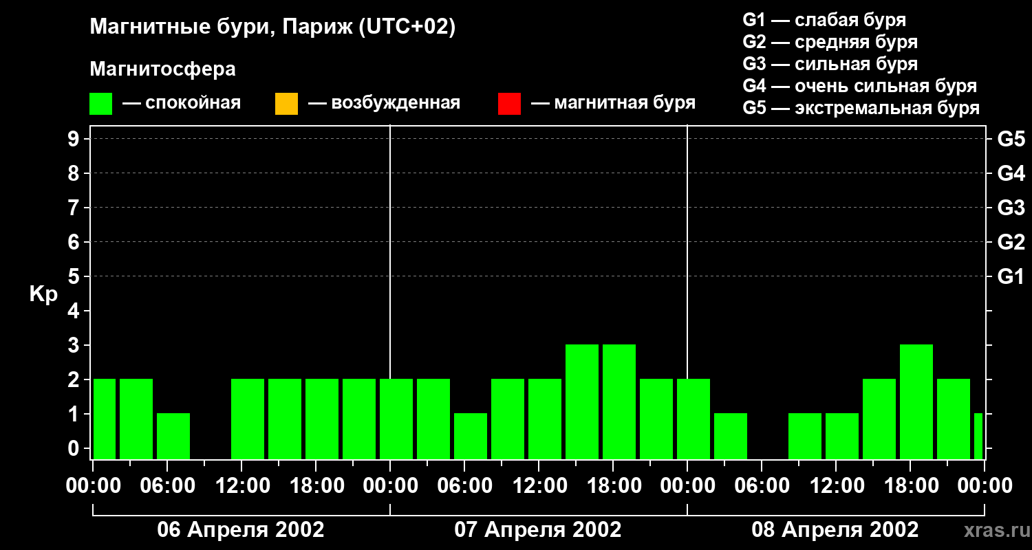 Изменения геомагнитного индекса Kp с 6 по 8 апреля 2002 года для средних широт