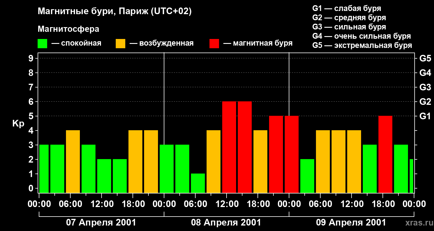 Изменения геомагнитного индекса Kp с 7 по 9 апреля 2001 года для средних широт