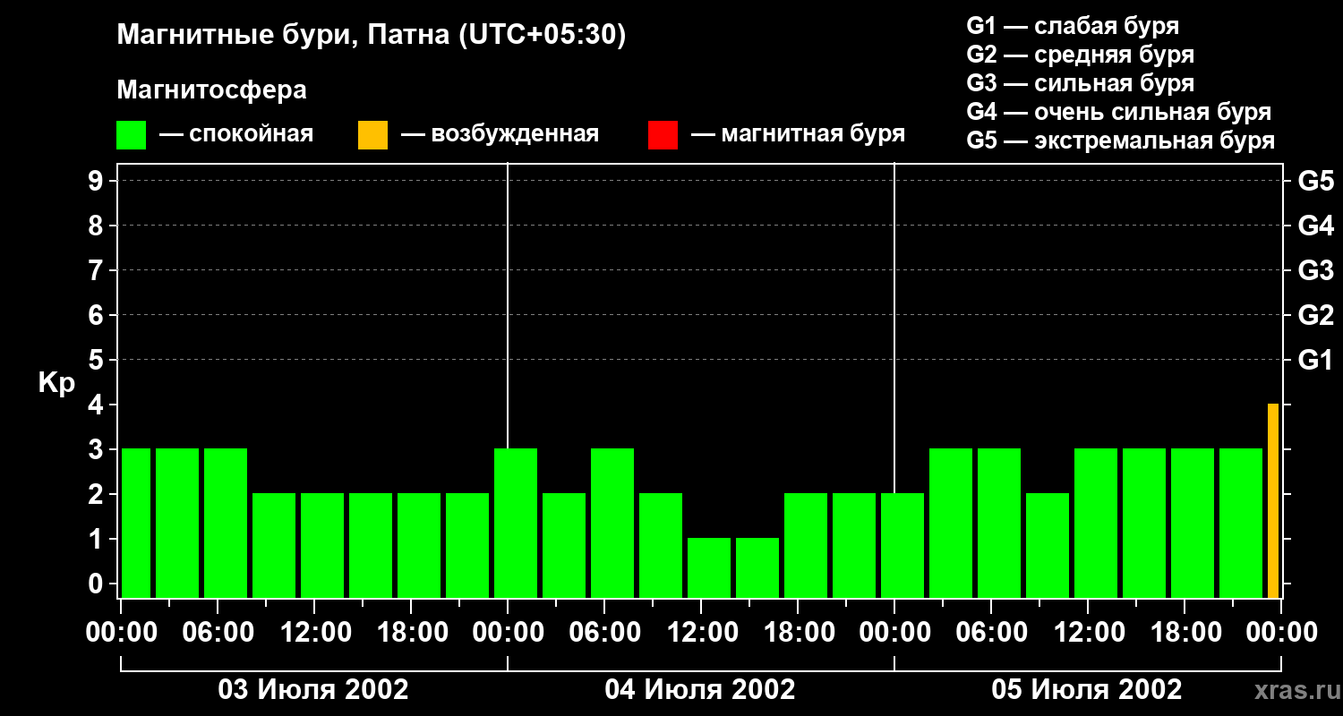 Изменения геомагнитного индекса Kp с 3 по 5 июля 2002 года для средних широт