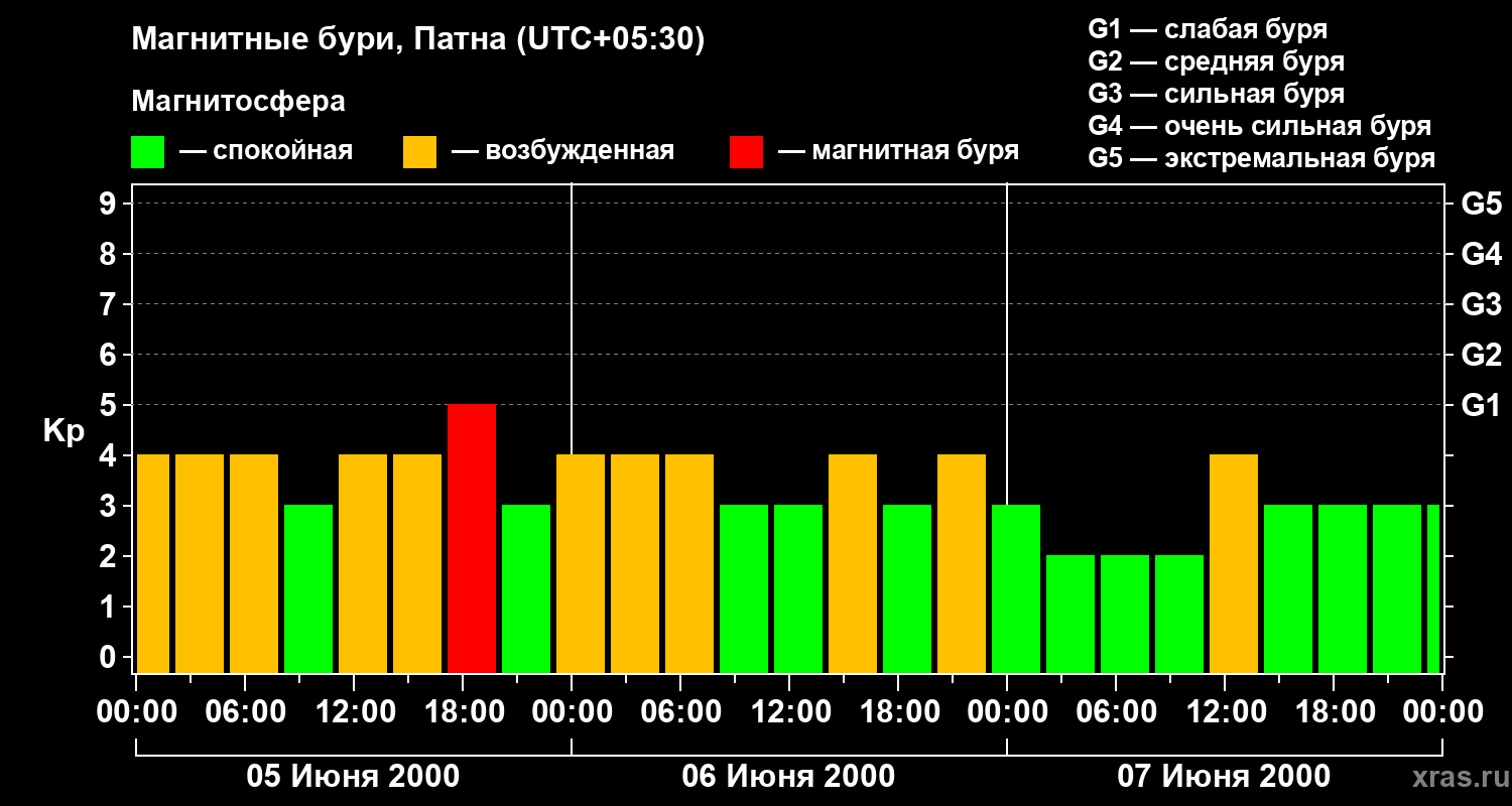 Изменения геомагнитного индекса Kp с 5 по 7 июня 2000 года для средних широт