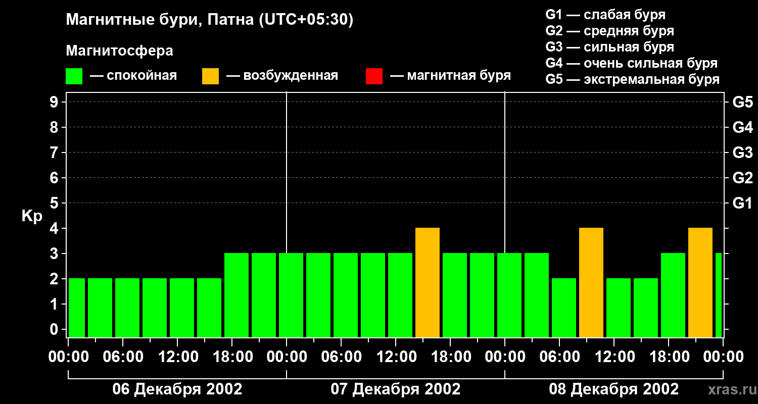 Изменения геомагнитного индекса Kp с 6 по 8 декабря 2002 года для средних широт