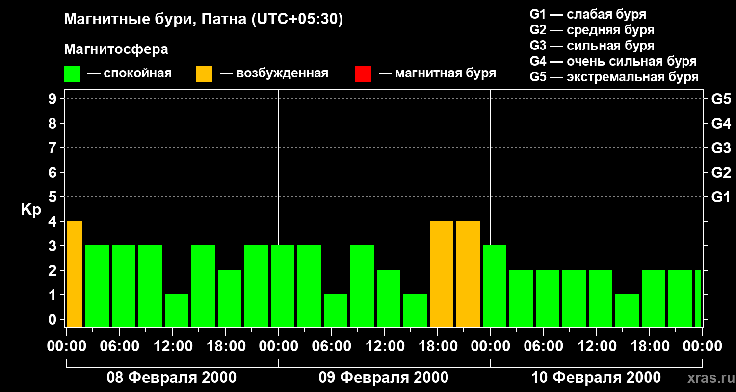 Изменения геомагнитного индекса Kp с 8 по 10 февраля 2000 года для средних широт