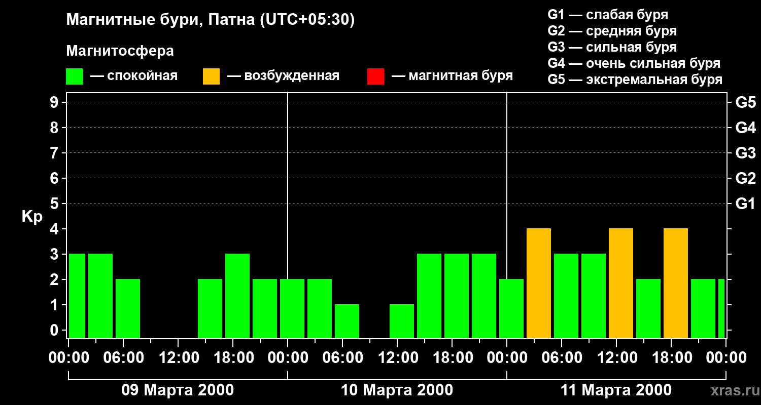 Изменения геомагнитного индекса Kp с 9 по 11 марта 2000 года для средних широт