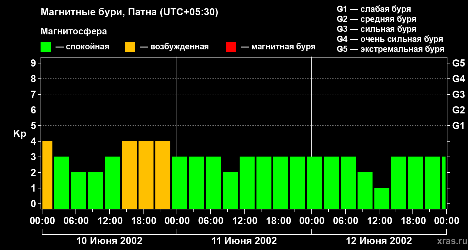 Изменения геомагнитного индекса Kp с 10 по 12 июня 2002 года для средних широт