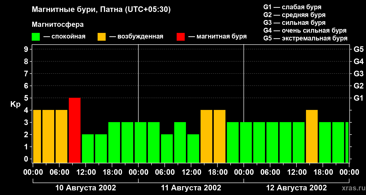 Изменения геомагнитного индекса Kp с 10 по 12 августа 2002 года для средних широт