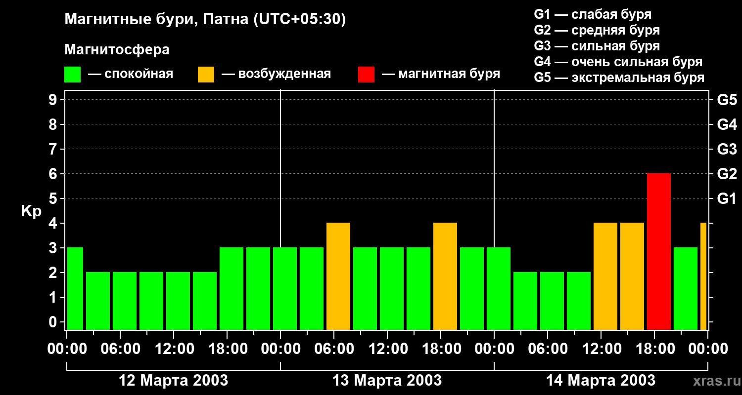 Изменения геомагнитного индекса Kp с 12 по 14 марта 2003 года для средних широт