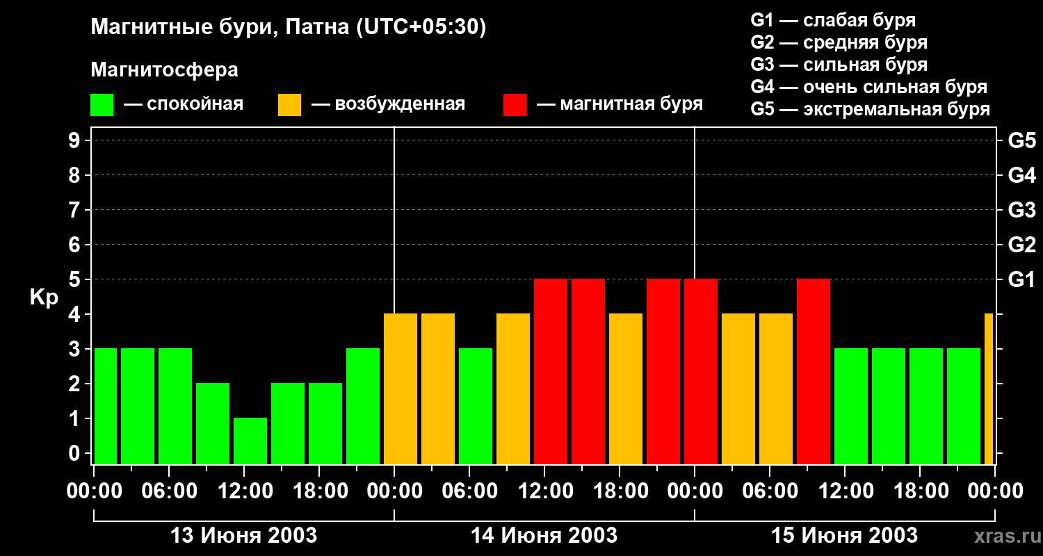Изменения геомагнитного индекса Kp с 13 по 15 июня 2003 года для средних широт