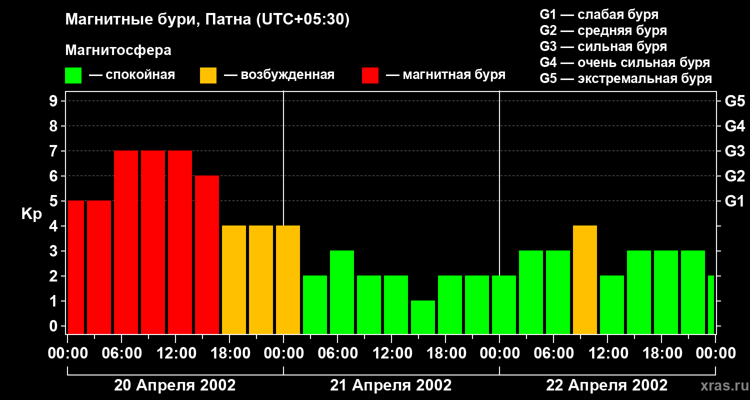Изменения геомагнитного индекса Kp с 20 по 22 апреля 2002 года для средних широт