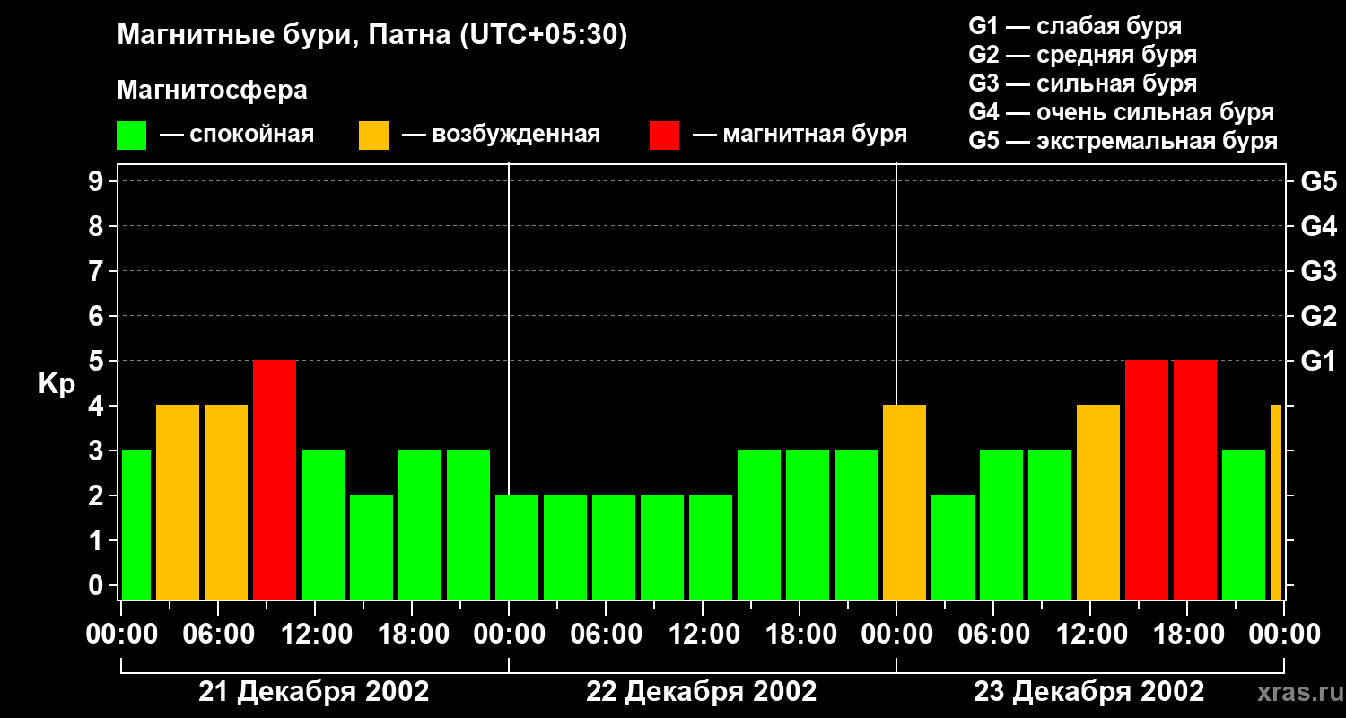 Изменения геомагнитного индекса Kp с 21 по 23 декабря 2002 года для средних широт
