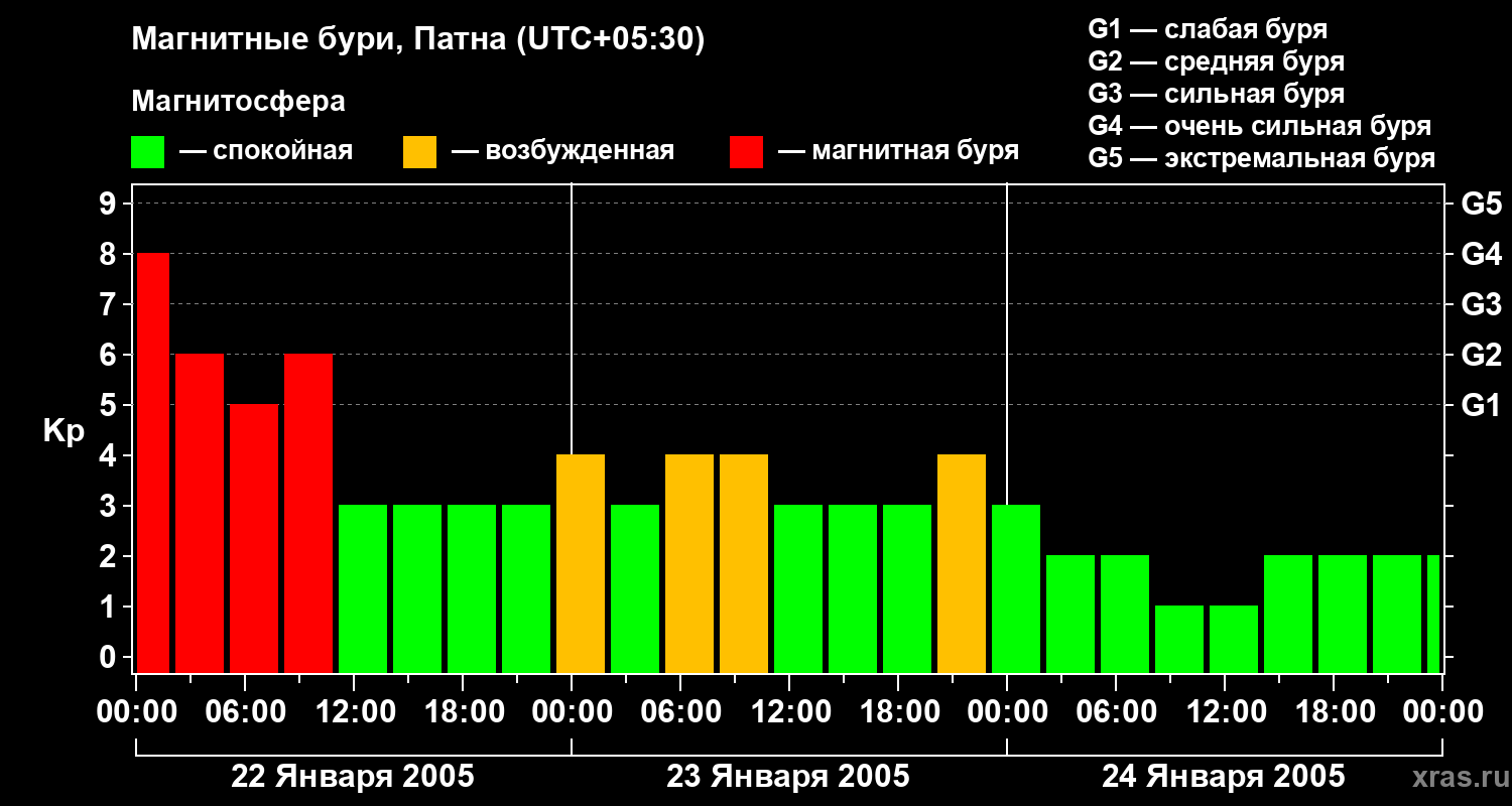 Изменения геомагнитного индекса Kp с 22 по 24 января 2005 года для средних широт
