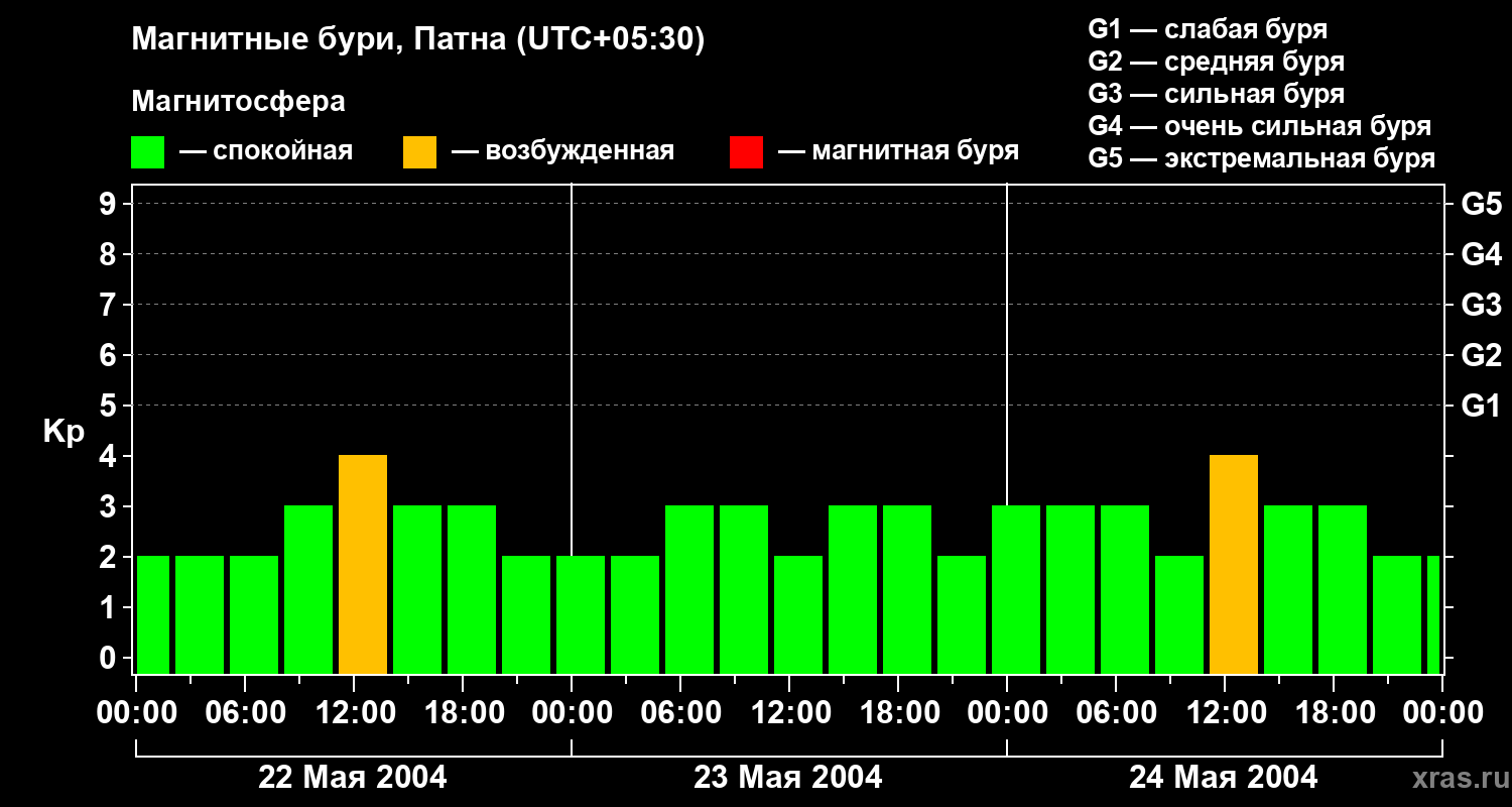 Изменения геомагнитного индекса Kp с 22 по 24 мая 2004 года для средних широт