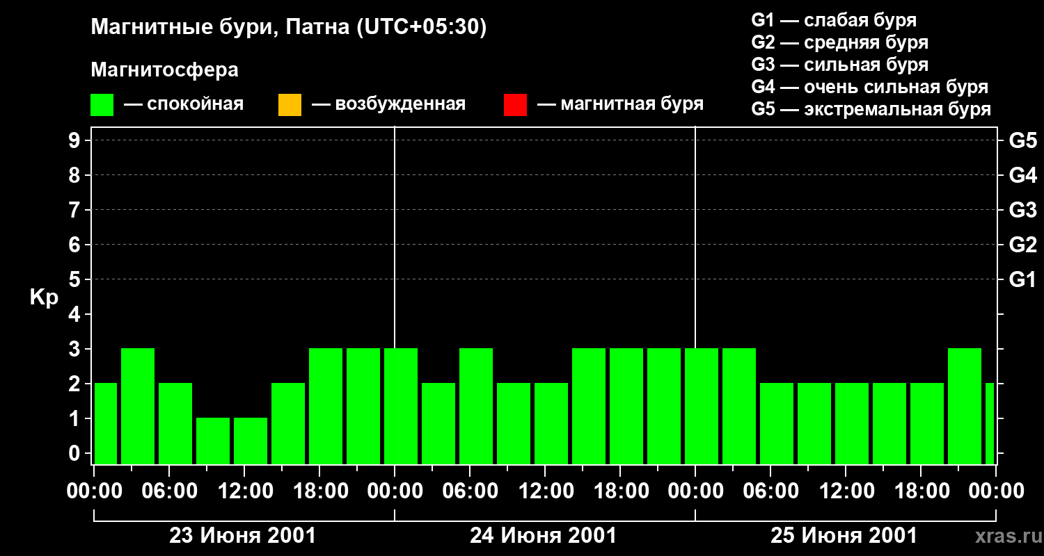 Изменения геомагнитного индекса Kp с 23 по 25 июня 2001 года для средних широт