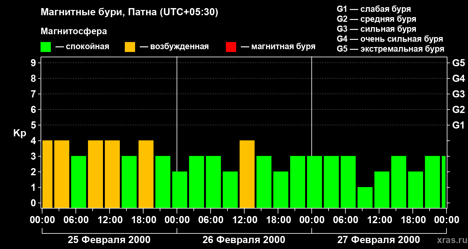 Изменения геомагнитного индекса Kp с 25 по 27 февраля 2000 года для средних широт