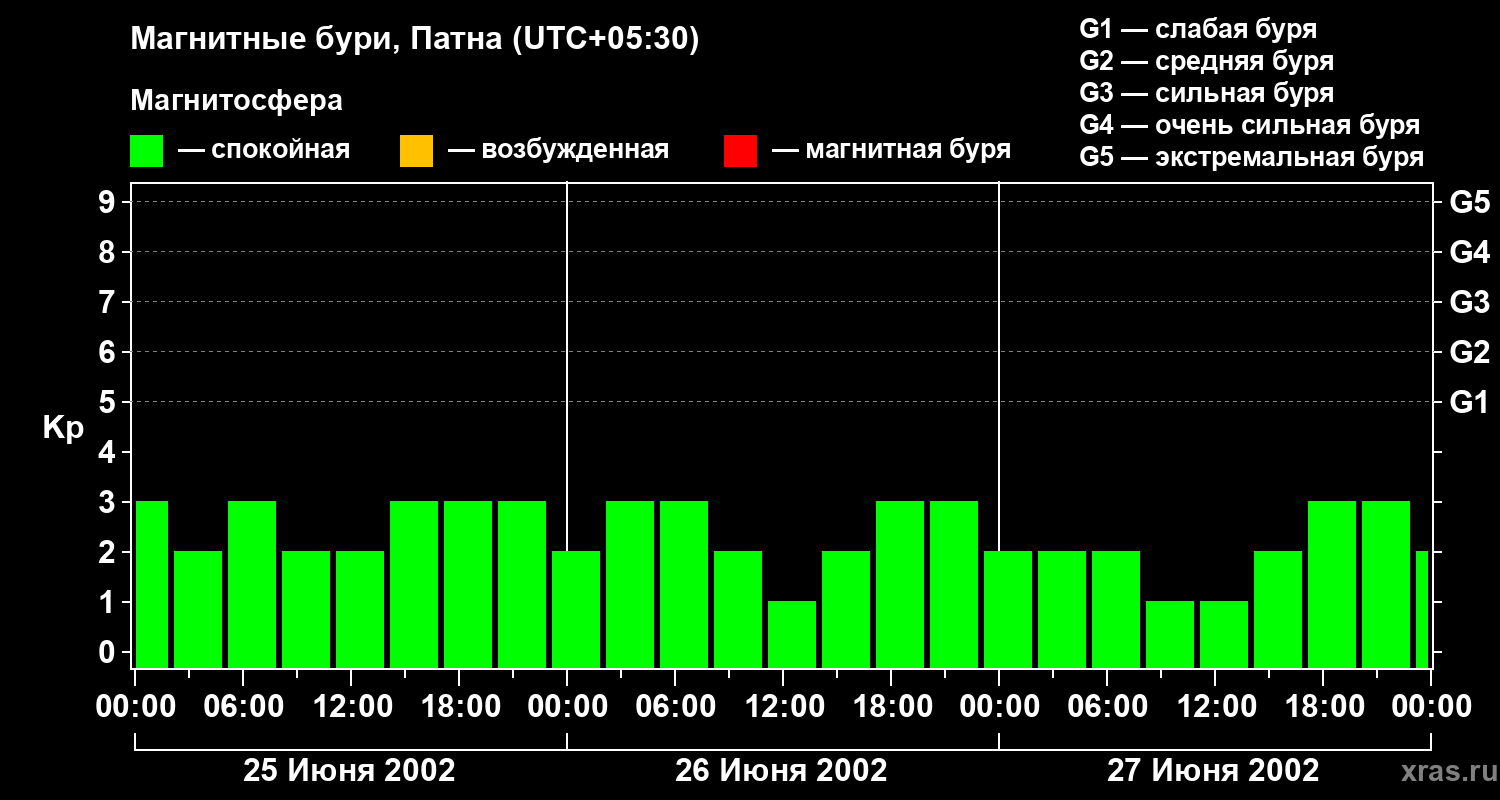 Изменения геомагнитного индекса Kp с 25 по 27 июня 2002 года для средних широт