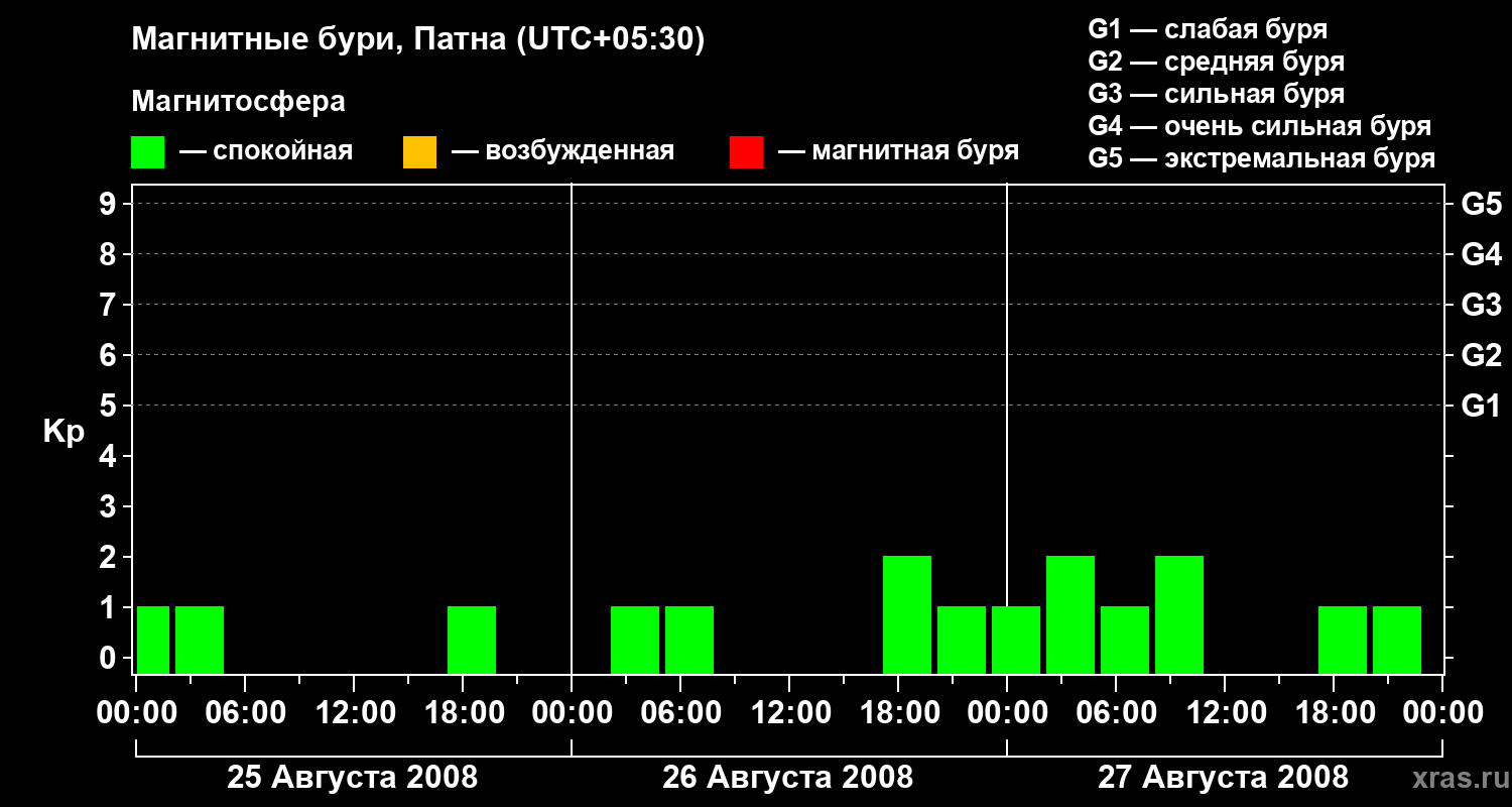Изменения геомагнитного индекса Kp с 25 по 27 августа 2008 года для средних широт