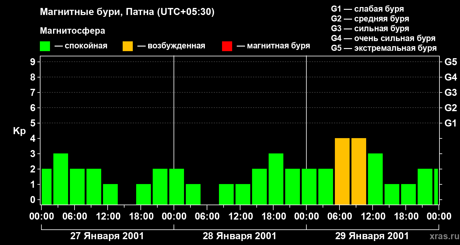 Изменения геомагнитного индекса Kp с 27 по 29 января 2001 года для средних широт