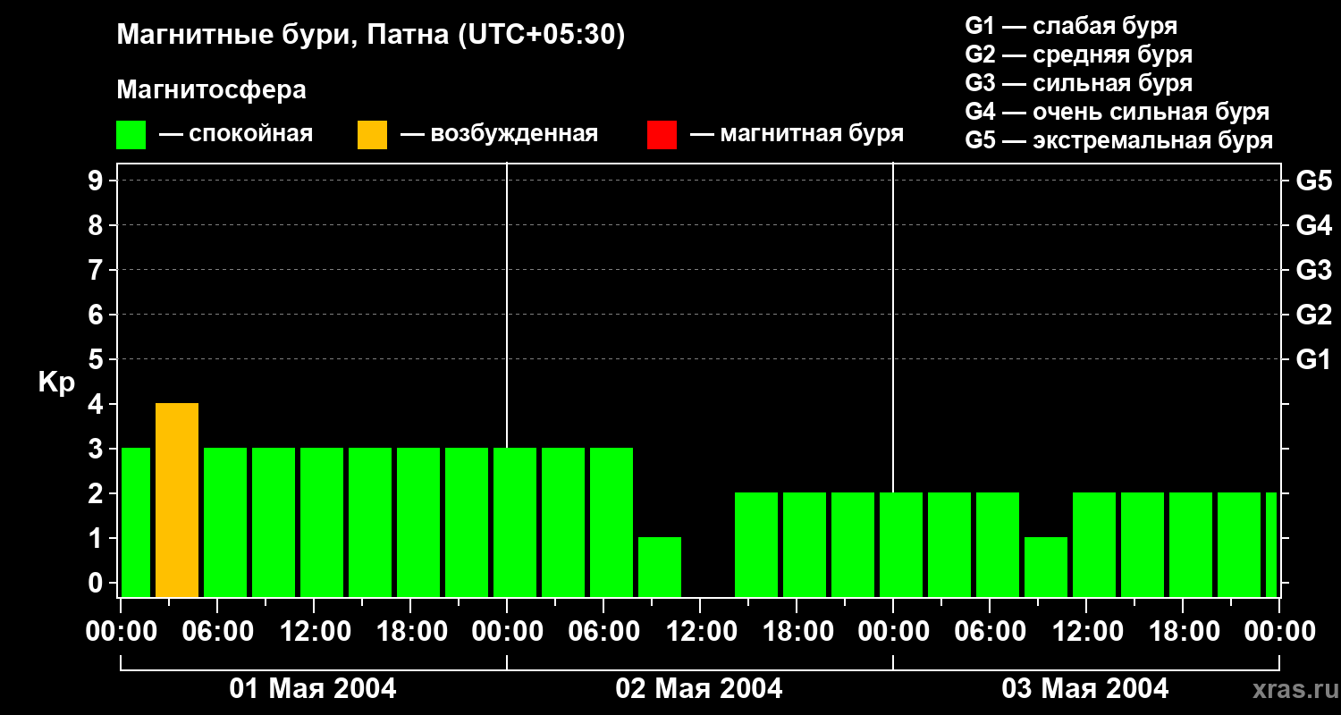 Изменения геомагнитного индекса Kp с 1 по 3 мая 2004 года для средних широт