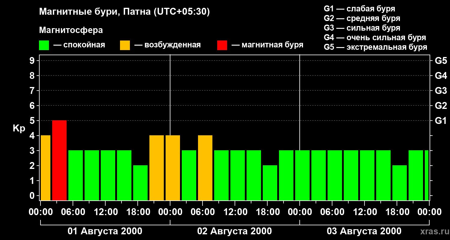 Изменения геомагнитного индекса Kp с 1 по 3 августа 2000 года для средних широт