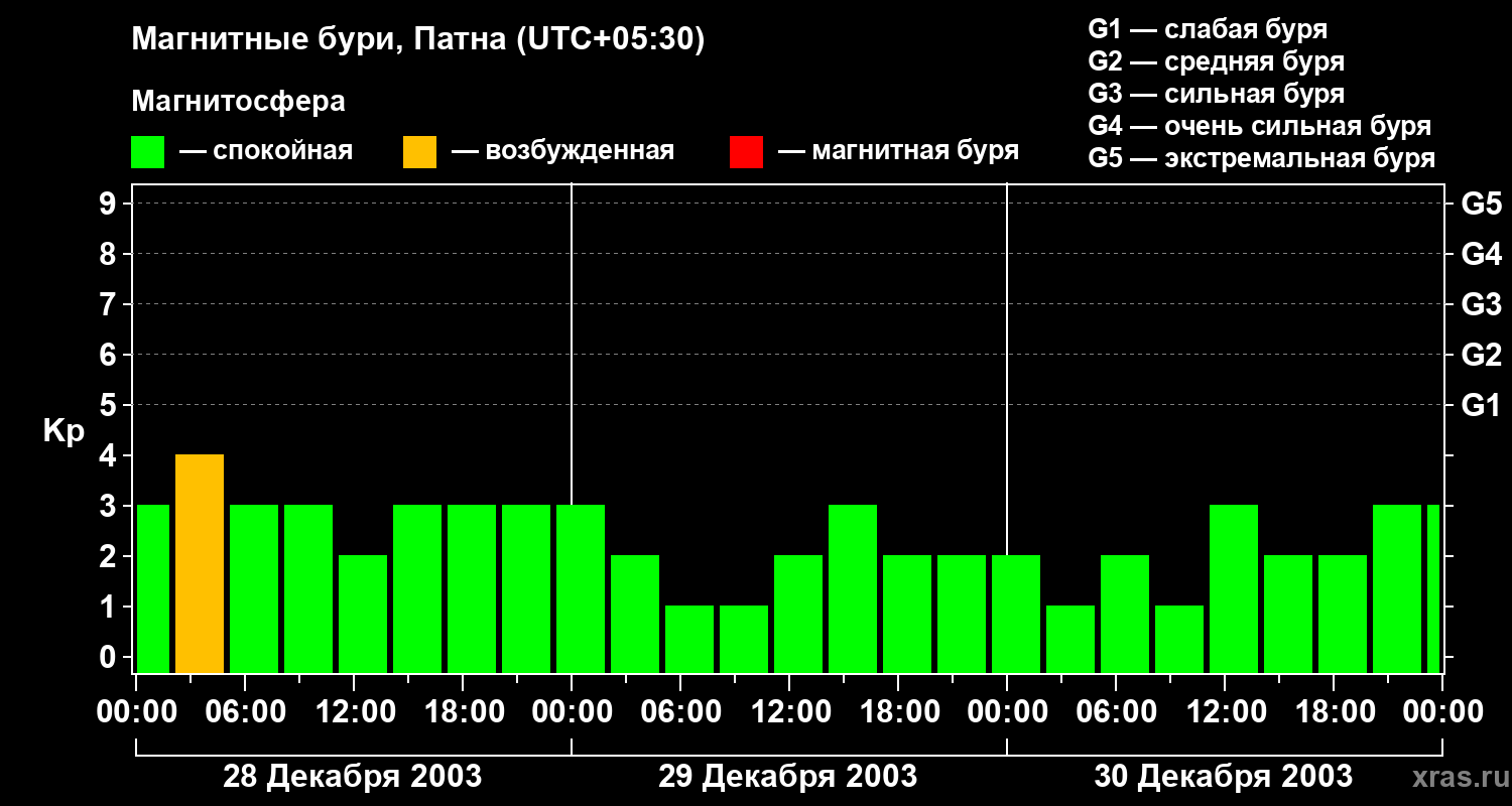 Изменения геомагнитного индекса Kp с 28 по 30 декабря 2003 года для средних широт