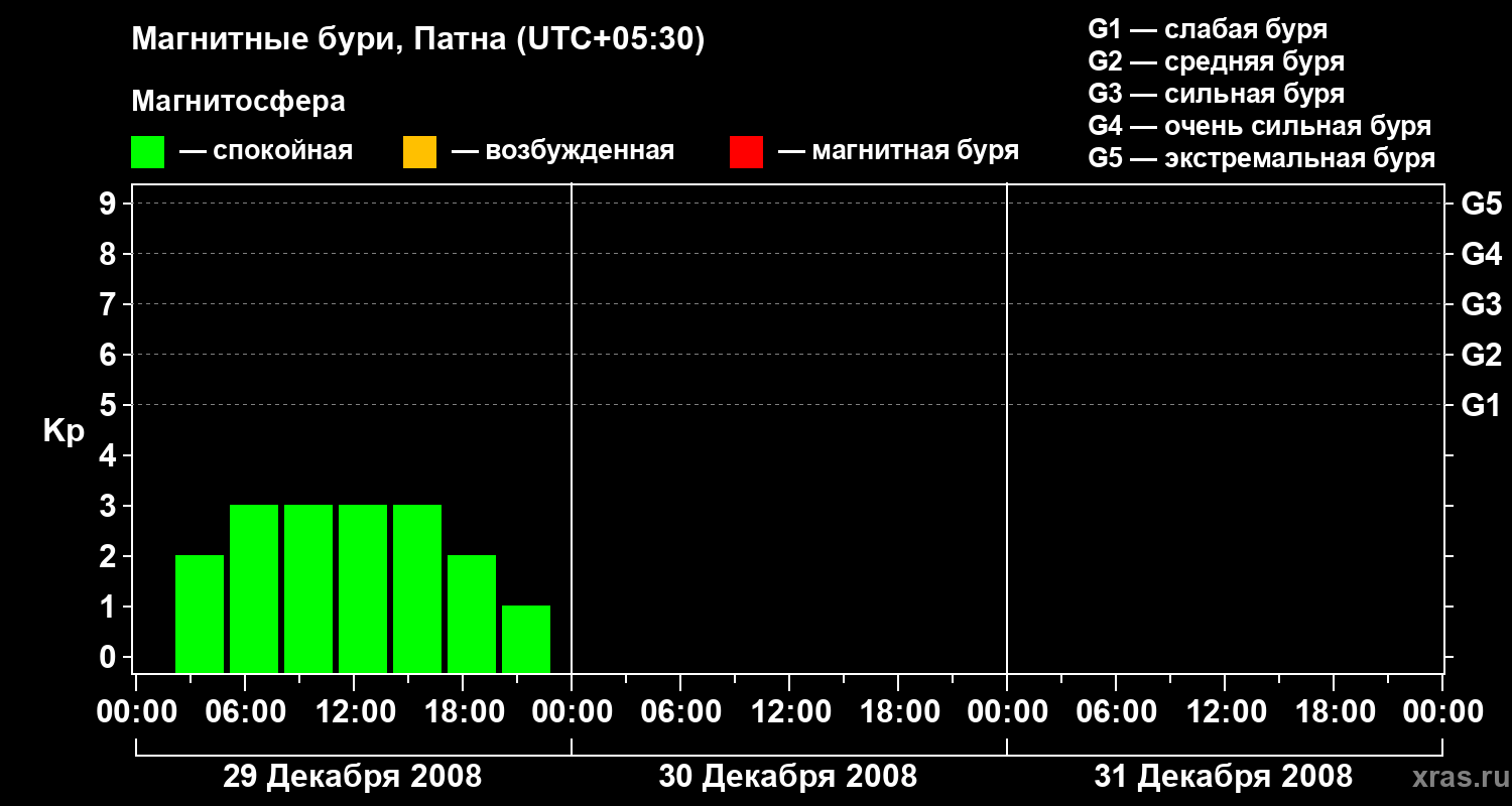 Изменения геомагнитного индекса Kp с 29 по 31 декабря 2008 года для средних широт