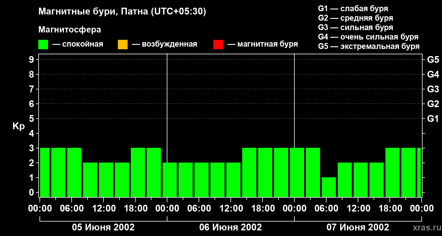 Изменения геомагнитного индекса Kp с 5 по 7 июня 2002 года для средних широт