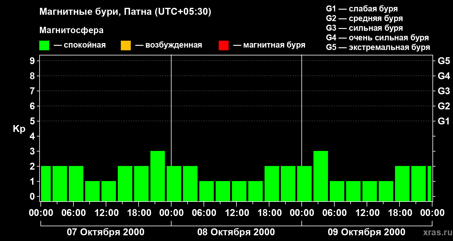 Изменения геомагнитного индекса Kp с 7 по 9 октября 2000 года для средних широт