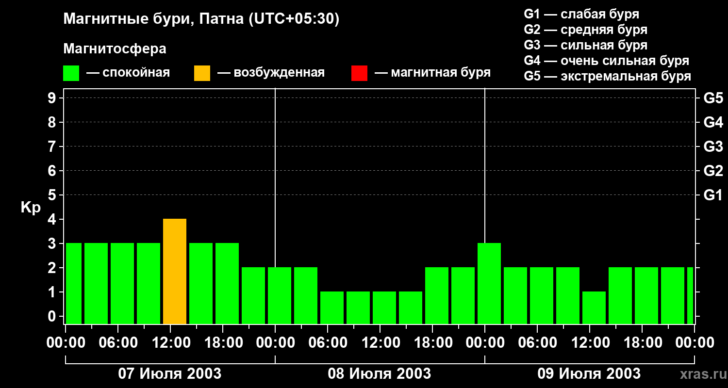 Изменения геомагнитного индекса Kp с 7 по 9 июля 2003 года для средних широт
