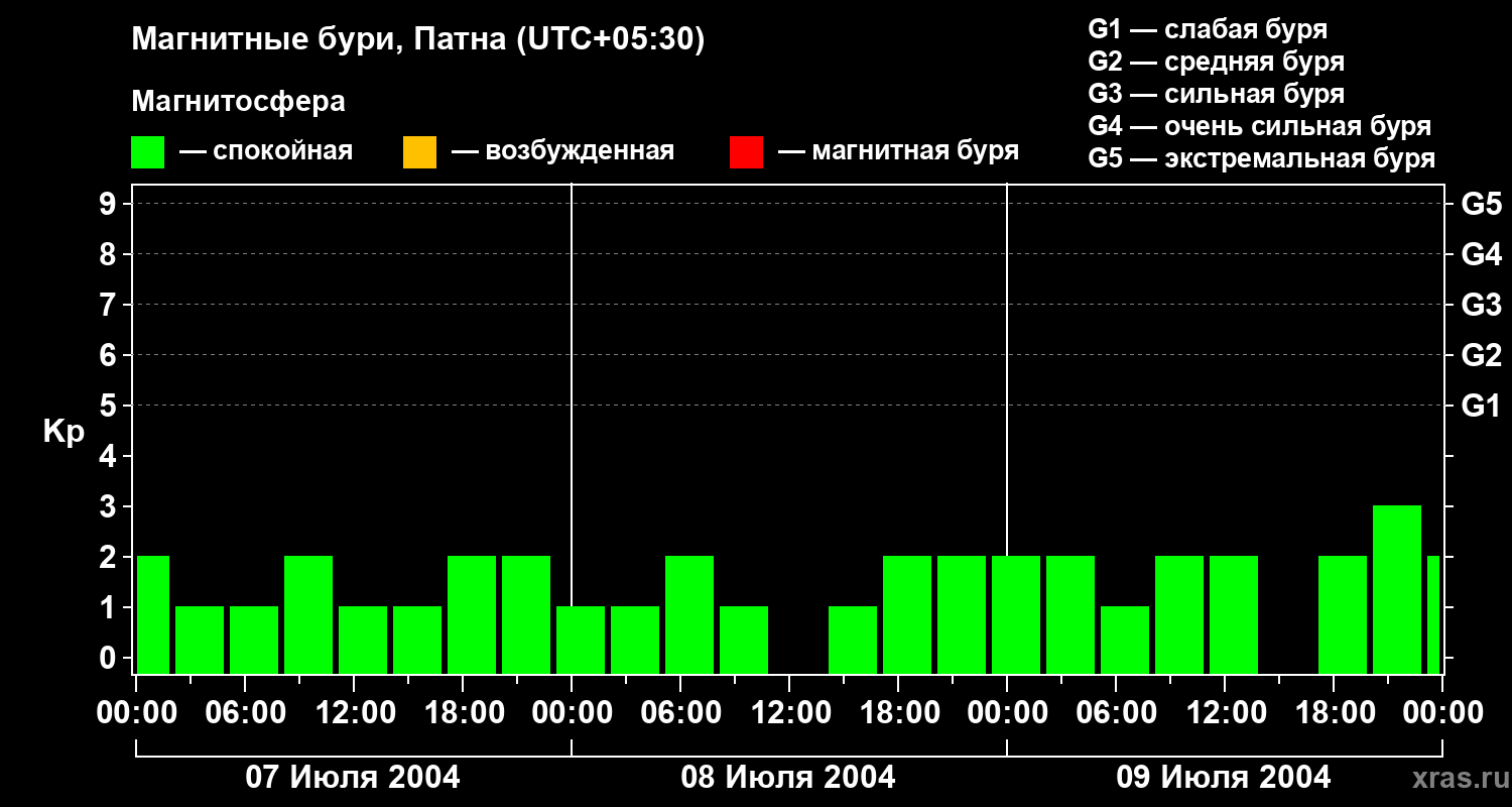 Изменения геомагнитного индекса Kp с 7 по 9 июля 2004 года для средних широт