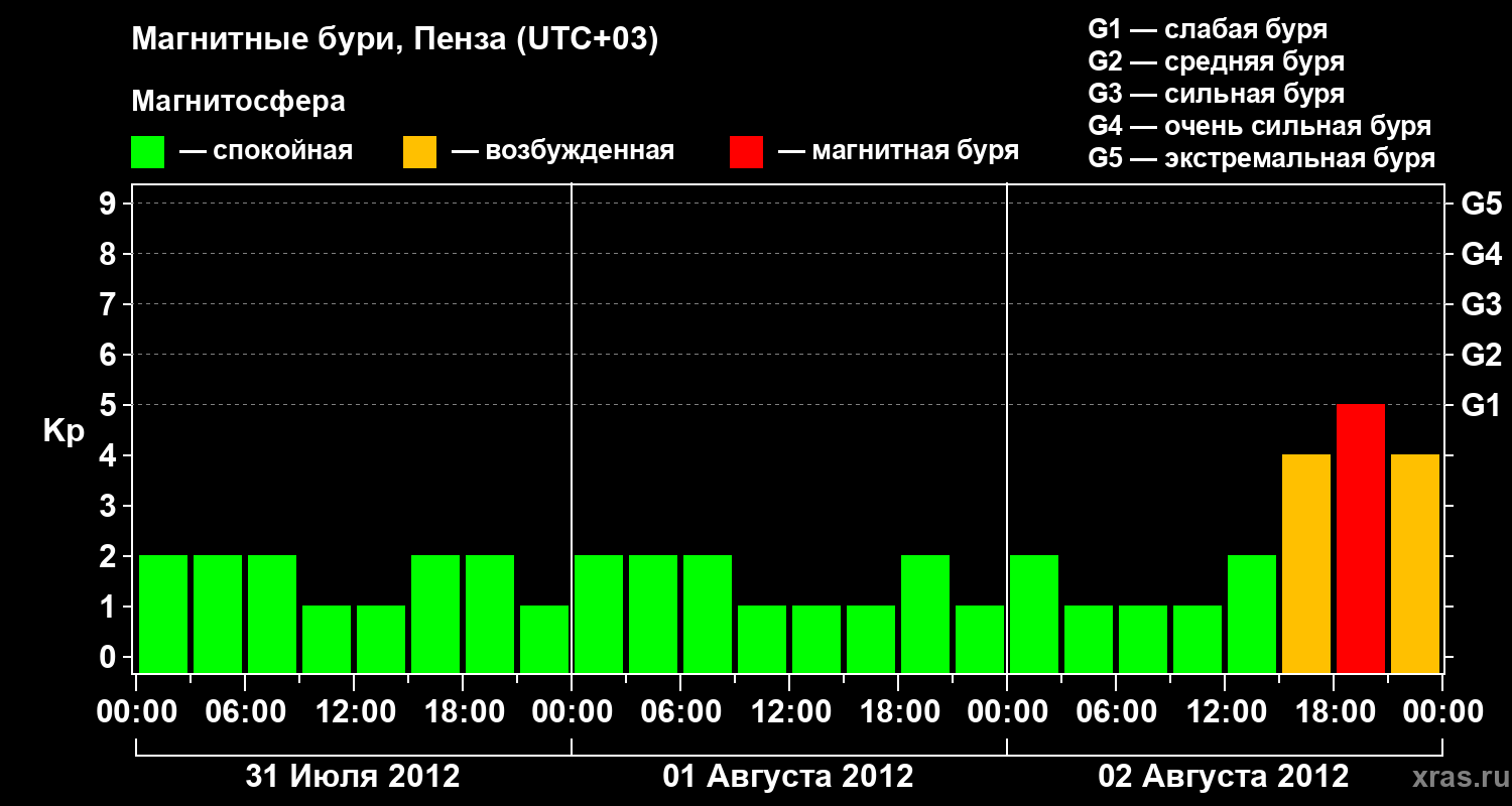Изменения геомагнитного индекса Kp с 31 июля по 2 августа 2012 года для средних широт