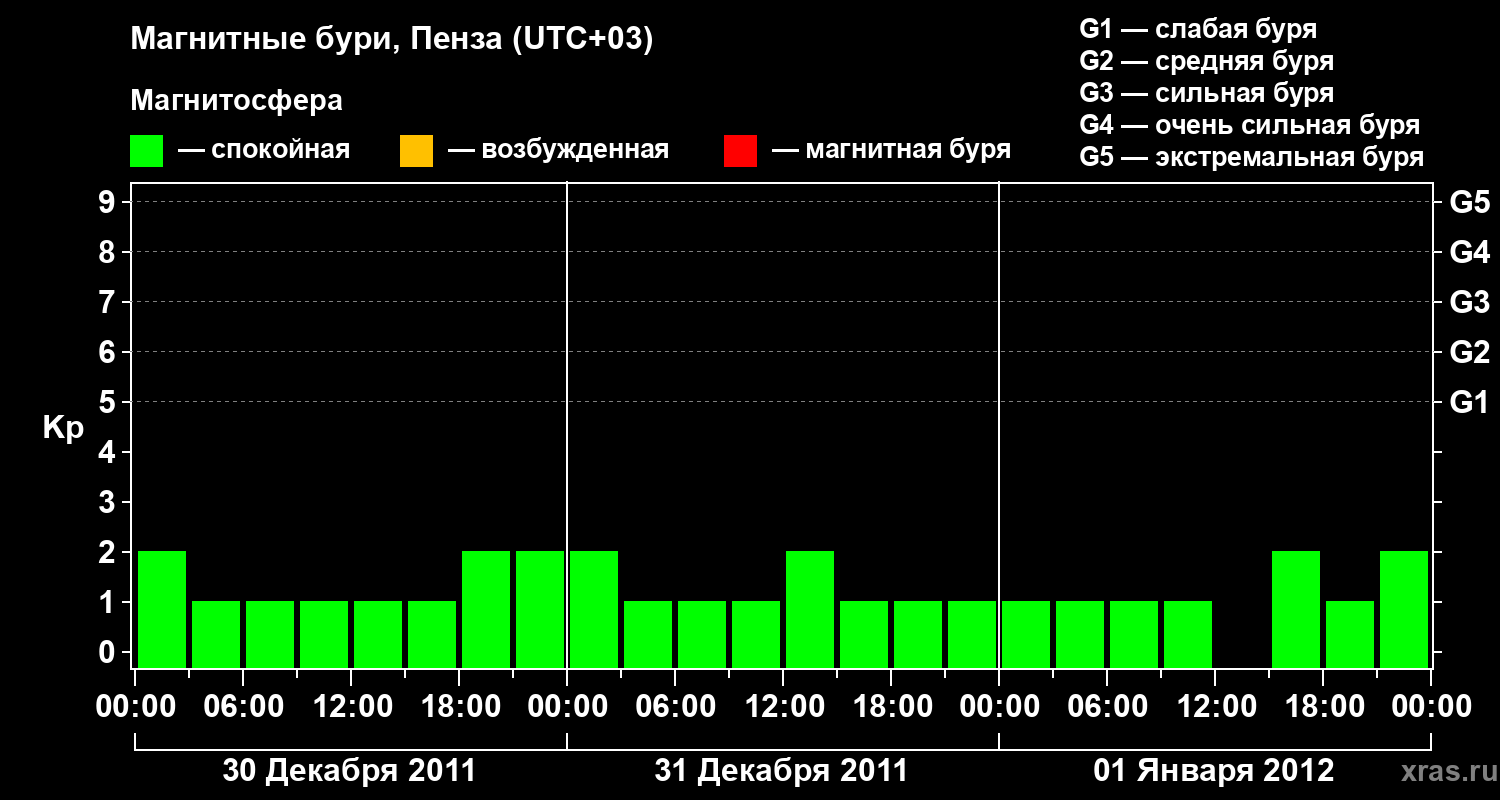 Изменения геомагнитного индекса Kp с 30 декабря 2011 года по 1 января 2012 года для средних широт