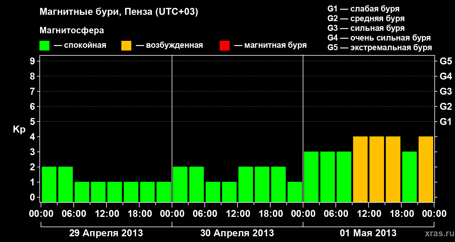 Изменения геомагнитного индекса Kp с 29 апреля по 1 мая 2013 года для средних широт