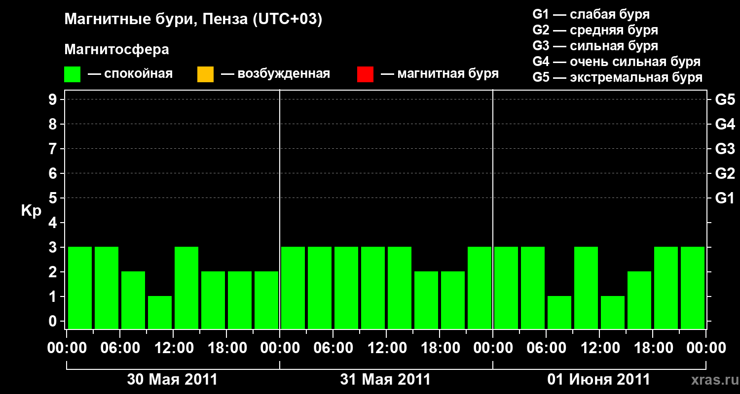 Изменения геомагнитного индекса Kp с 30 мая по 1 июня 2011 года для средних широт