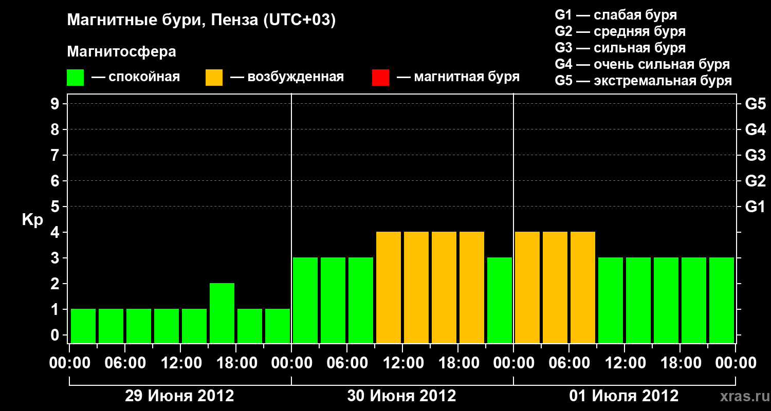 Изменения геомагнитного индекса Kp с 29 июня по 1 июля 2012 года для средних широт