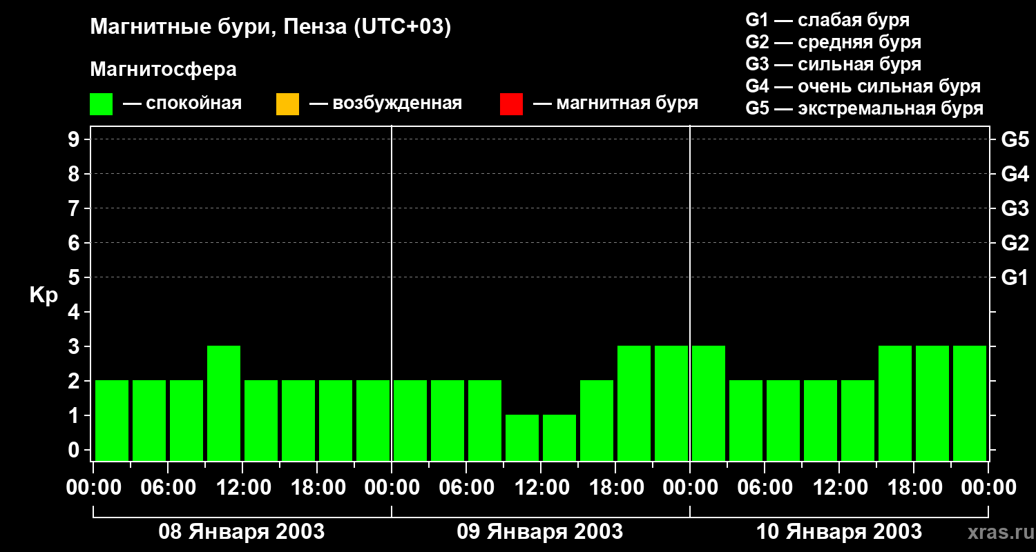 Изменения геомагнитного индекса Kp с 8 по 10 января 2003 года для средних широт