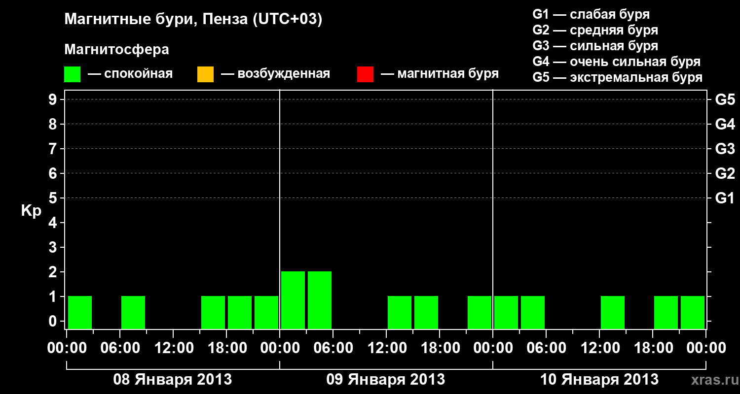 Изменения геомагнитного индекса Kp с 8 по 10 января 2013 года для средних широт