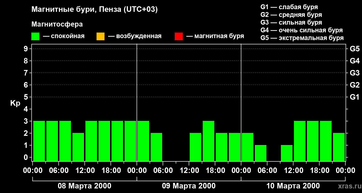 Изменения геомагнитного индекса Kp с 8 по 10 марта 2000 года для средних широт