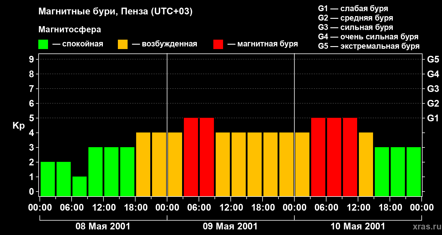 Изменения геомагнитного индекса Kp с 8 по 10 мая 2001 года для средних широт
