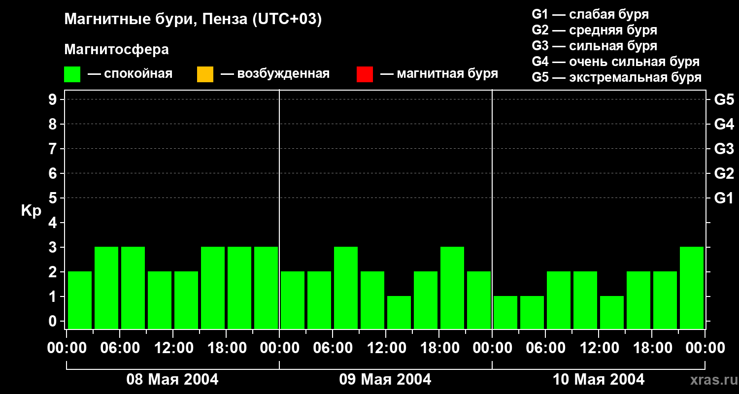 Изменения геомагнитного индекса Kp с 8 по 10 мая 2004 года для средних широт
