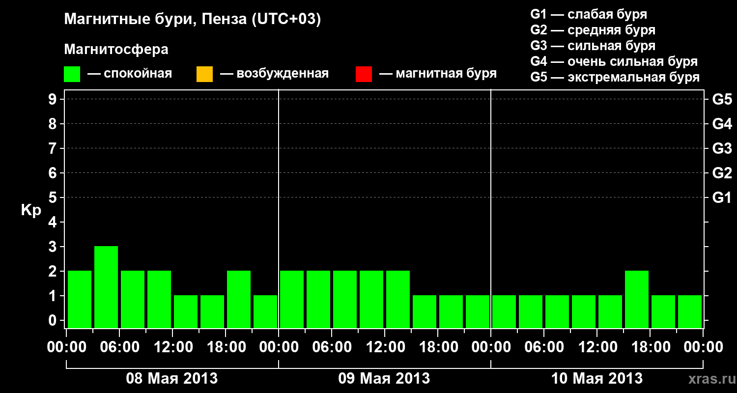 Изменения геомагнитного индекса Kp с 8 по 10 мая 2013 года для средних широт