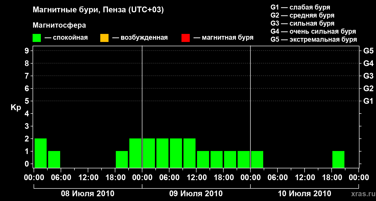 Изменения геомагнитного индекса Kp с 8 по 10 июля 2010 года для средних широт