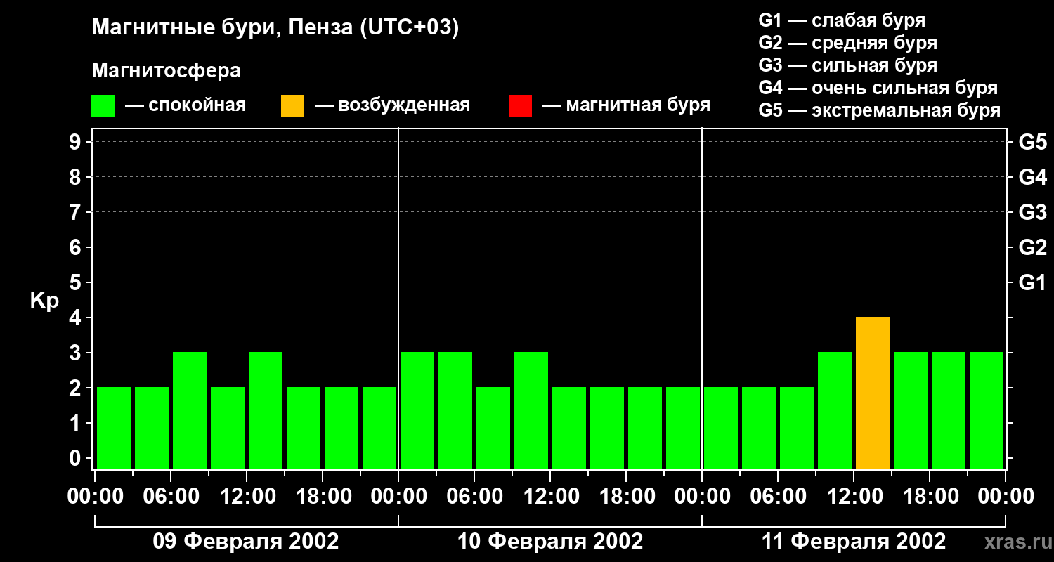 Изменения геомагнитного индекса Kp с 9 по 11 февраля 2002 года для средних широт