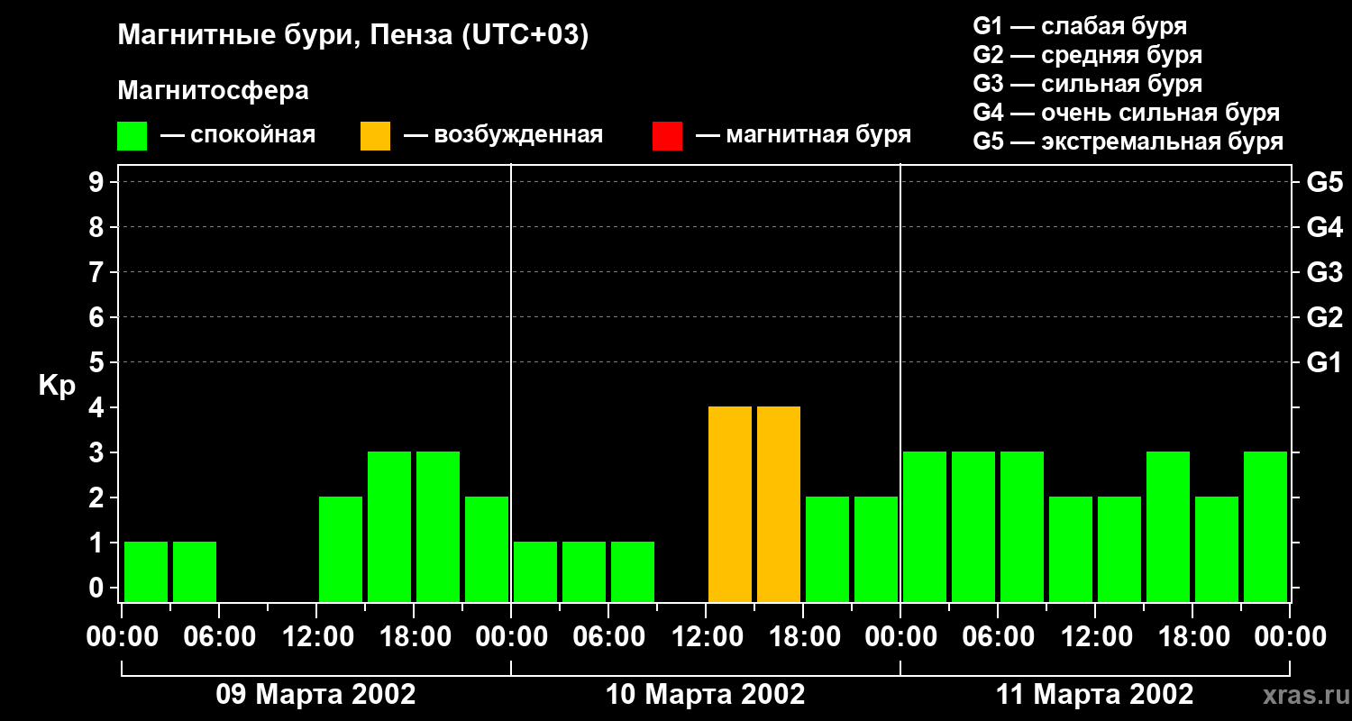 Изменения геомагнитного индекса Kp с 9 по 11 марта 2002 года для средних широт