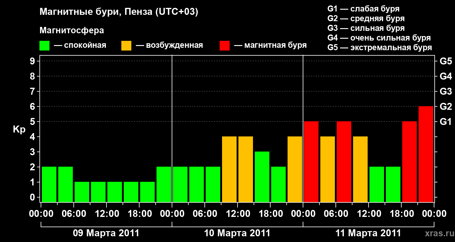 Изменения геомагнитного индекса Kp с 9 по 11 марта 2011 года для средних широт