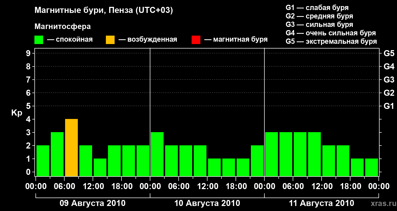 Изменения геомагнитного индекса Kp с 9 по 11 августа 2010 года для средних широт