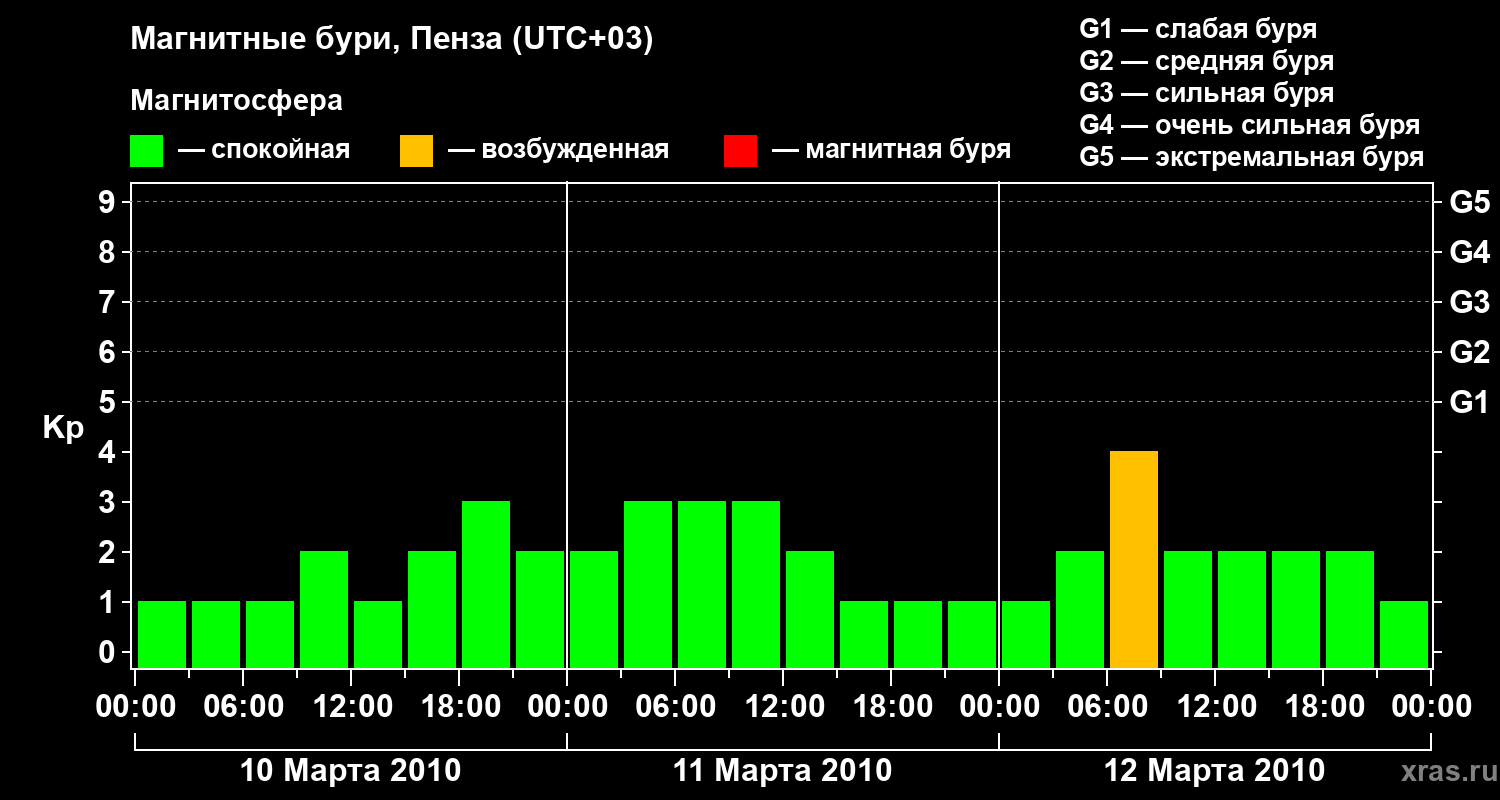 Изменения геомагнитного индекса Kp с 10 по 12 марта 2010 года для средних широт