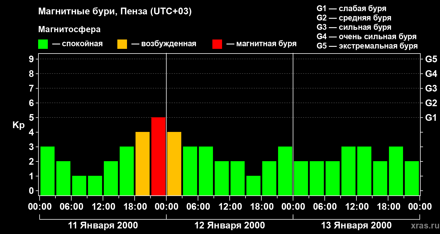 Изменения геомагнитного индекса Kp с 11 по 13 января 2000 года для средних широт