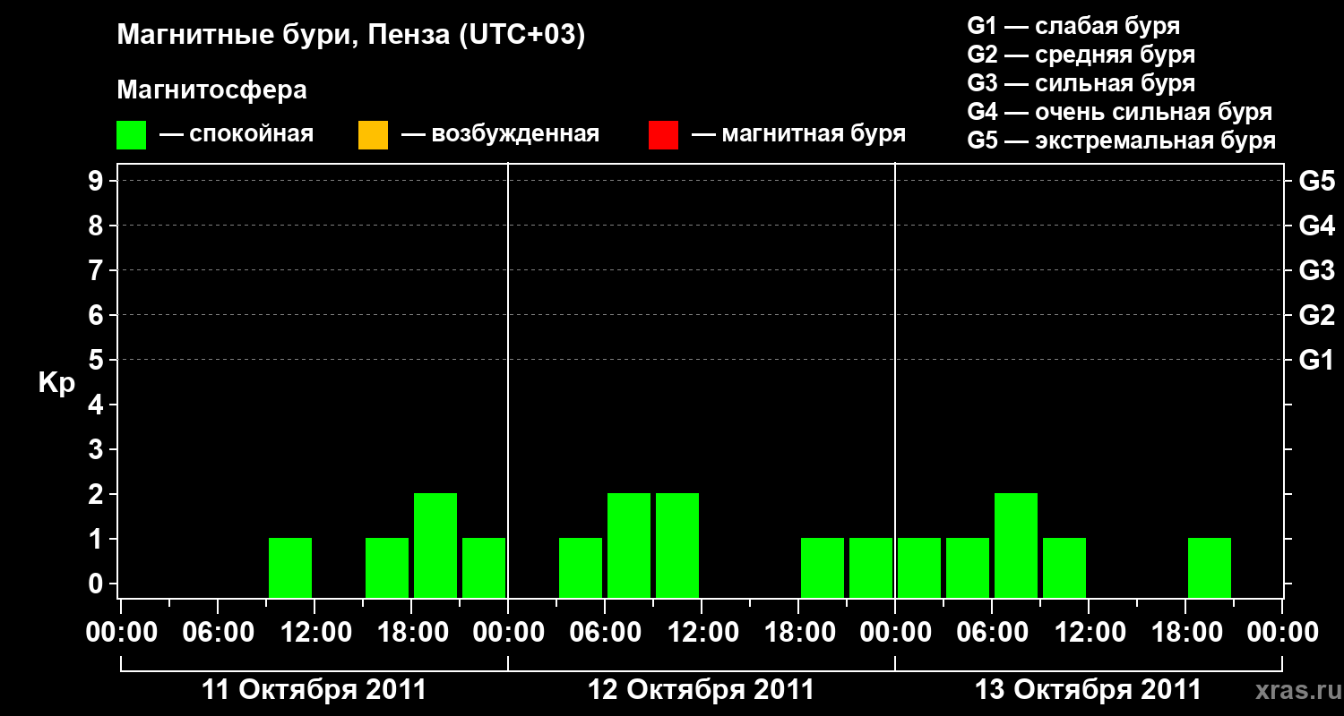Изменения геомагнитного индекса Kp с 11 по 13 октября 2011 года для средних широт