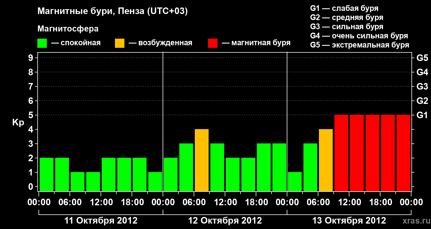 Изменения геомагнитного индекса Kp с 11 по 13 октября 2012 года для средних широт