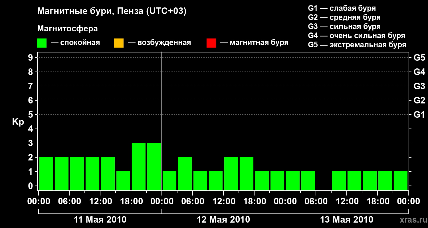 Изменения геомагнитного индекса Kp с 11 по 13 мая 2010 года для средних широт